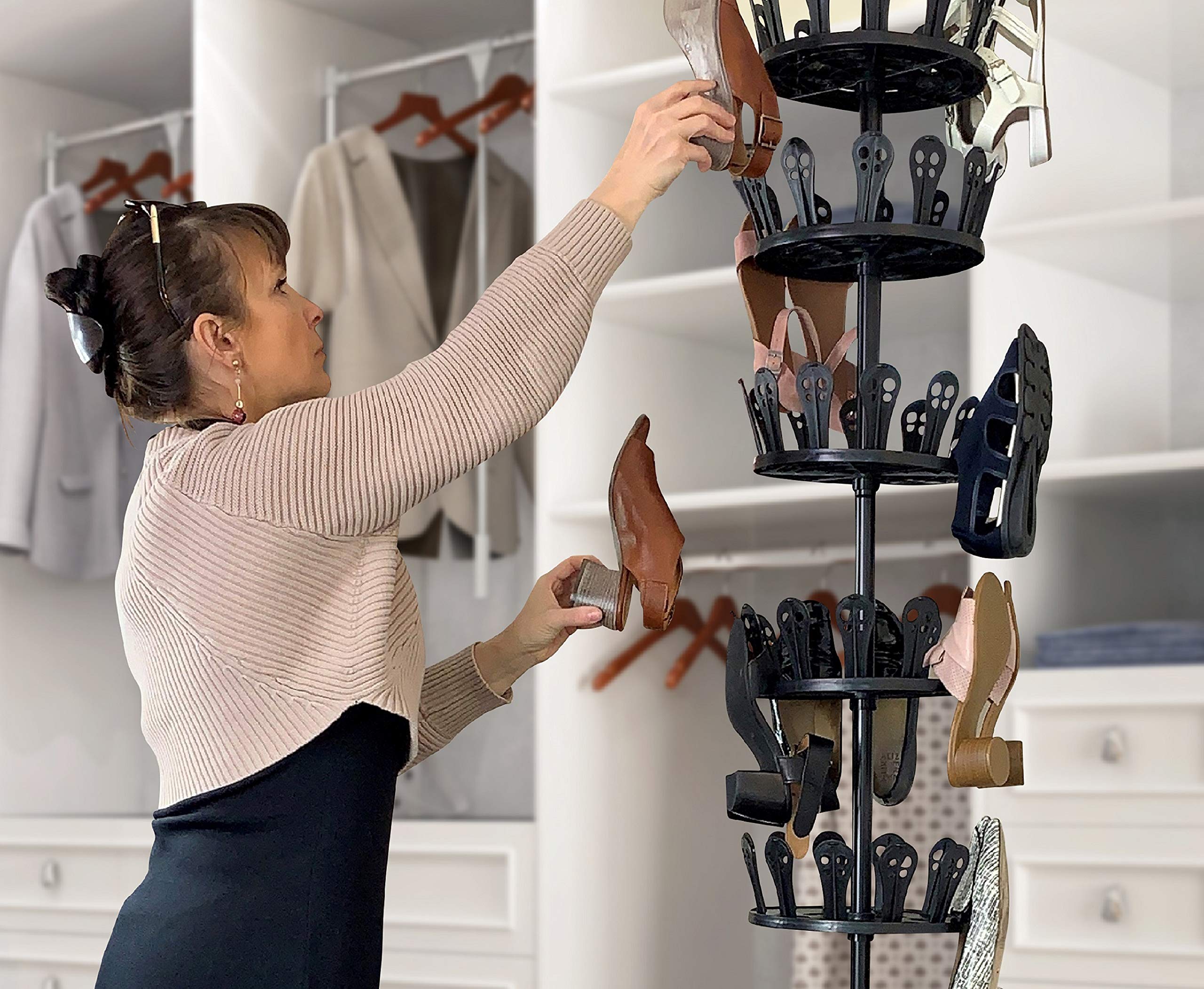 This convenient tree holds up to 36 pairs of shoes in a 12-inch cross section of space. Suzanne Rogers - French closet features floor to ceiling built-in wardrobe cabinets filled with slanted shoe racks and orange storage boxes situated behind French chairs and French table atop French rug. Whitmor 6 Tier Floor-To-Ceiling Shoe Spinner - Adjustable with Basket 6998 Household Essentials 2132-1 Metal 3-Tier Revolving Shoe and Boot Rack - Silver 5399 Household Essentials Revolving Four-Tier Shoe Tree Silver Finish 3880 Special offers and product promotions.