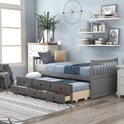 Twin Captain Bed With Trundle And Drawers 3 In One Solid Wood Daybed With Storage For Kids Guests Grey Gray Amazon In Home Kitchen