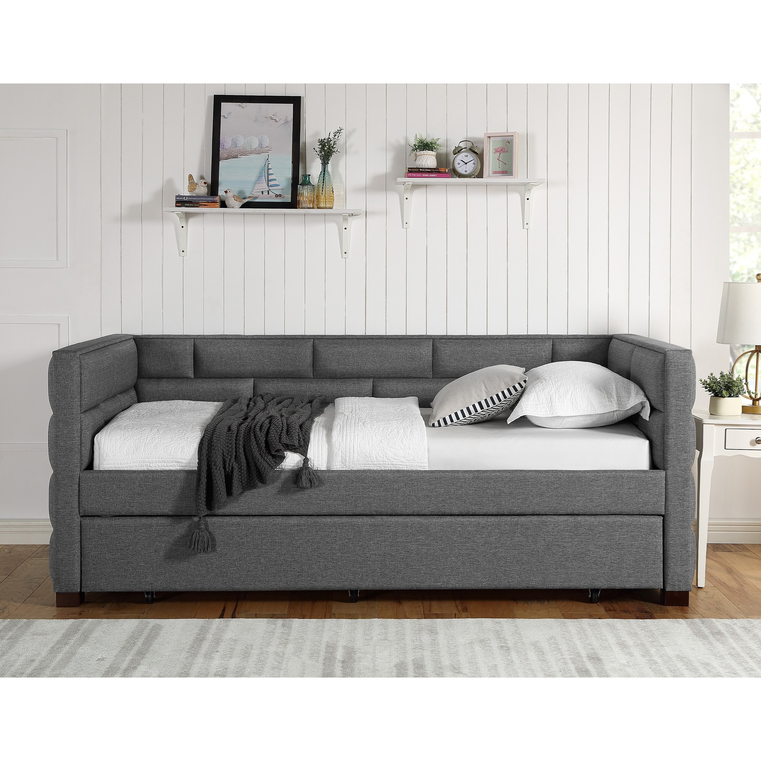 Boyd Sleep Umbria Upholstered Platform Daybed and Pull Out Guest Trundle Bed Frame Mattress Foundation with Strong Wood Slat Supports. About this item Make sure this fits by entering your model number. Baxton Studio Haylie Modern and Contemporary Dark Grey Fabric Upholstered Full Size Daybed with Roll-Out Trundle Bed.