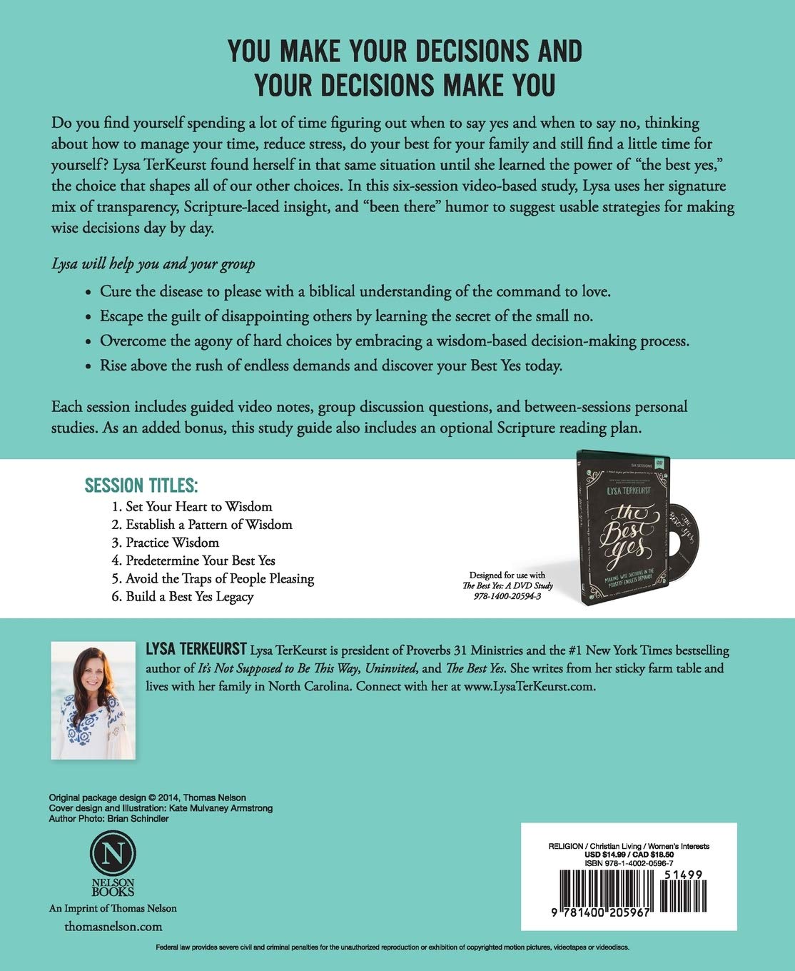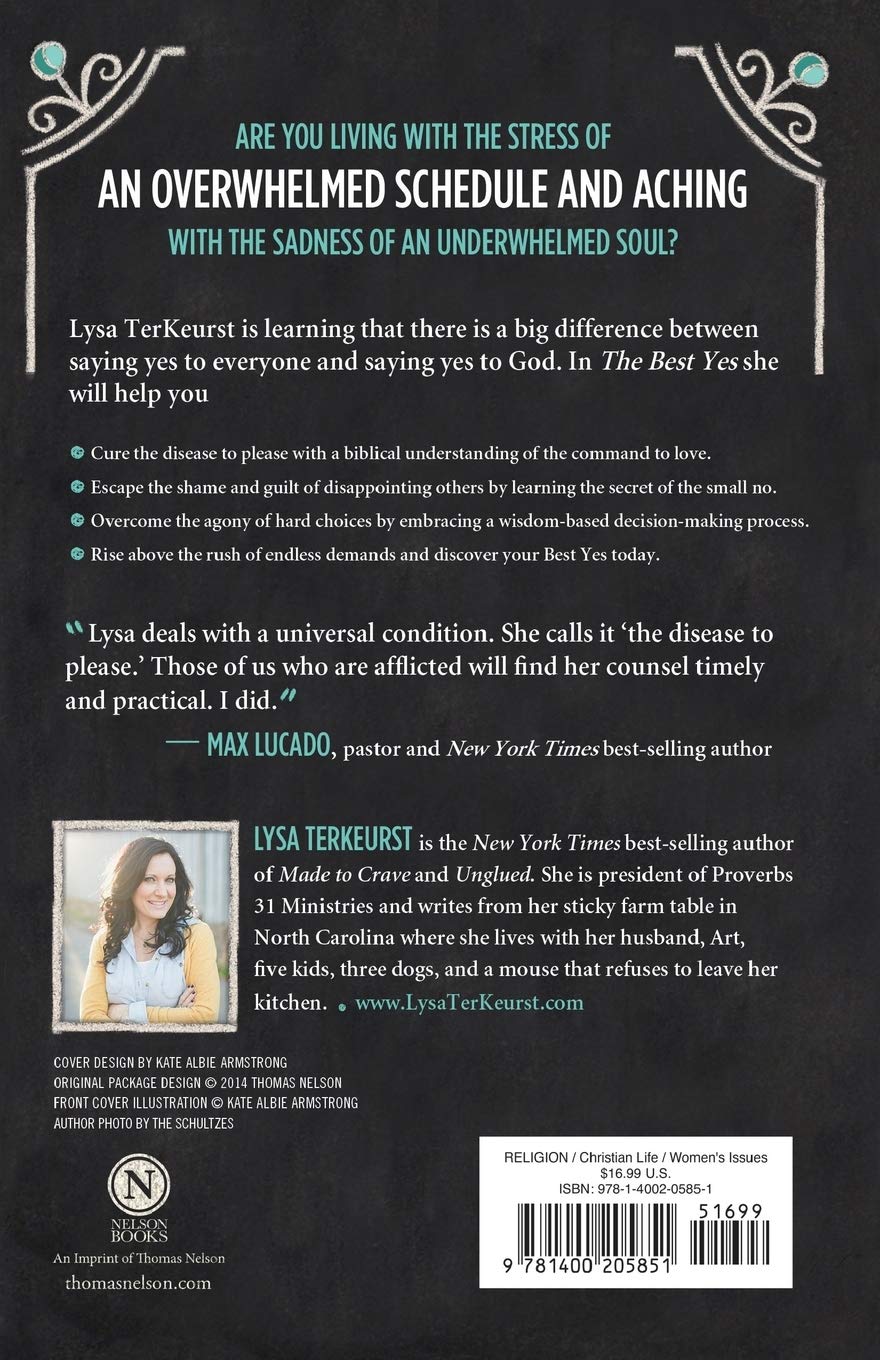 TerKeurst Lysa Anderson Christine. If you are not reading this book with a group or using the other study materials you will still really enjoy this book. Set Your Heart to WisdomEstablish a Pattern of WisdomPractice WisdomPredetermine Your Best YesAvoid the Traps of People PleasingBuild a Best Yes Legacy Designed for use with The Best Yes Video Study 97801400205943 sold separately.
